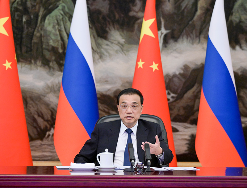 12月5日,国务院总理李克强在北京人民大会堂同俄罗斯总理米舒斯京共同主持中俄总理第二十七次定期会晤。会晤以视频方式举行。国务院副总理、中俄投资合作委员会、能源合作委员会中方主席韩正出席。新华社记者 高洁 摄
