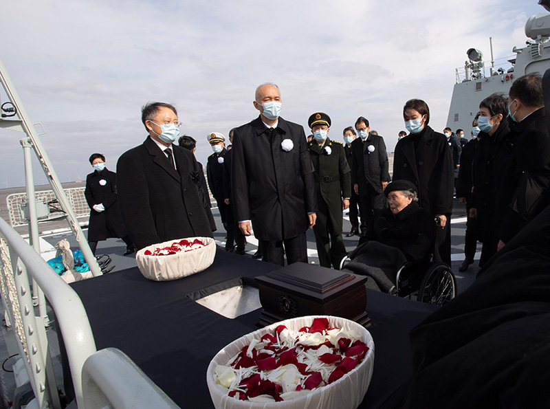 12月11日,遵照江泽民同志及其亲属的意愿,敬爱的江泽民同志的骨灰在长江入海口撒入大海。受党中央委托,中共中央政治局常委、中央书记处书记蔡奇等领导同志和江泽民同志的夫人王冶坪等亲属护送骨灰撒放。新华社记者 李涛 摄