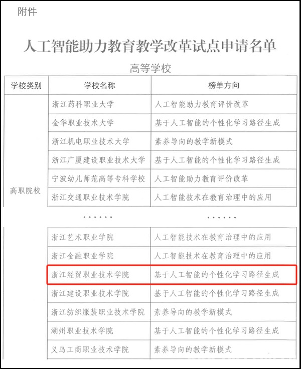 近日,浙江省教育系统网络安全和信息化工作领导小组办公室印发了《关于同意开展浙江省人工智能助力教育教学改革试点的通知》,我校凭借“基于人工智能的个性化学习路径生成”项目获评试点单位,标志着人工智能教育领域的创新实践迈出关键一步。